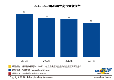 从整体需求来看,智联招聘数据显示,2014年面向毕业生的职位发布量相比去年增长10.14%,毕业生就业竞争指数有所下降。智联招聘认为,随着民营企业、第三产业等对大学生的吸收能力和欢迎程度有增无减;二、三线城市快速扩张对拓展市场的需求日益增强,都为毕业生带来了职业发展的机会。智联招聘认为,“就业难”并不是难在岗位的缺乏,而是难在毕业生对未来方向、社会需求的认知错位及自我缺乏了解产生迷茫。