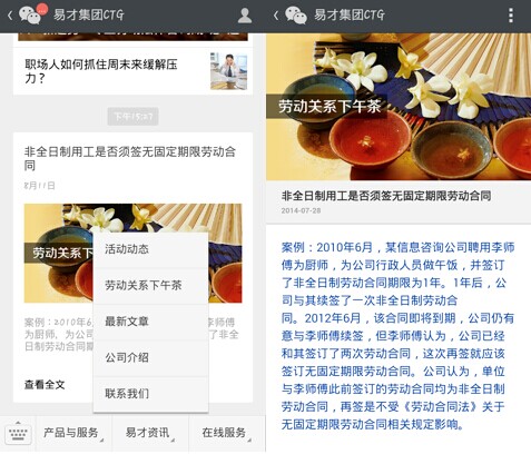 移动互联无疑在划时代地改变着人们的生活方式,手机、pad已成为街头巷尾行人手中的伴行工具。触角灵敏的服务型企业,在新技术应用上总是不落人后,纷纷推出新媒体在线服务功能,让服务时刻伴随在客户身边,酒店、茶馆,车厢、码头,举手投足之间,一个触屏点击,专业服务、行业信息纷至沓来,贴心体验、温情满满。中国最专业的人力资源外包服务提供商易才集团更是这方面的行家里手,不时升级微信平台,让服务变身成为你的掌上人事管家。在最新升级的易才集团官方微信中,更全面地完成了在线服务模块,强化了与粉丝的互动功能,从而提供了更多个性化和针对性的服务。