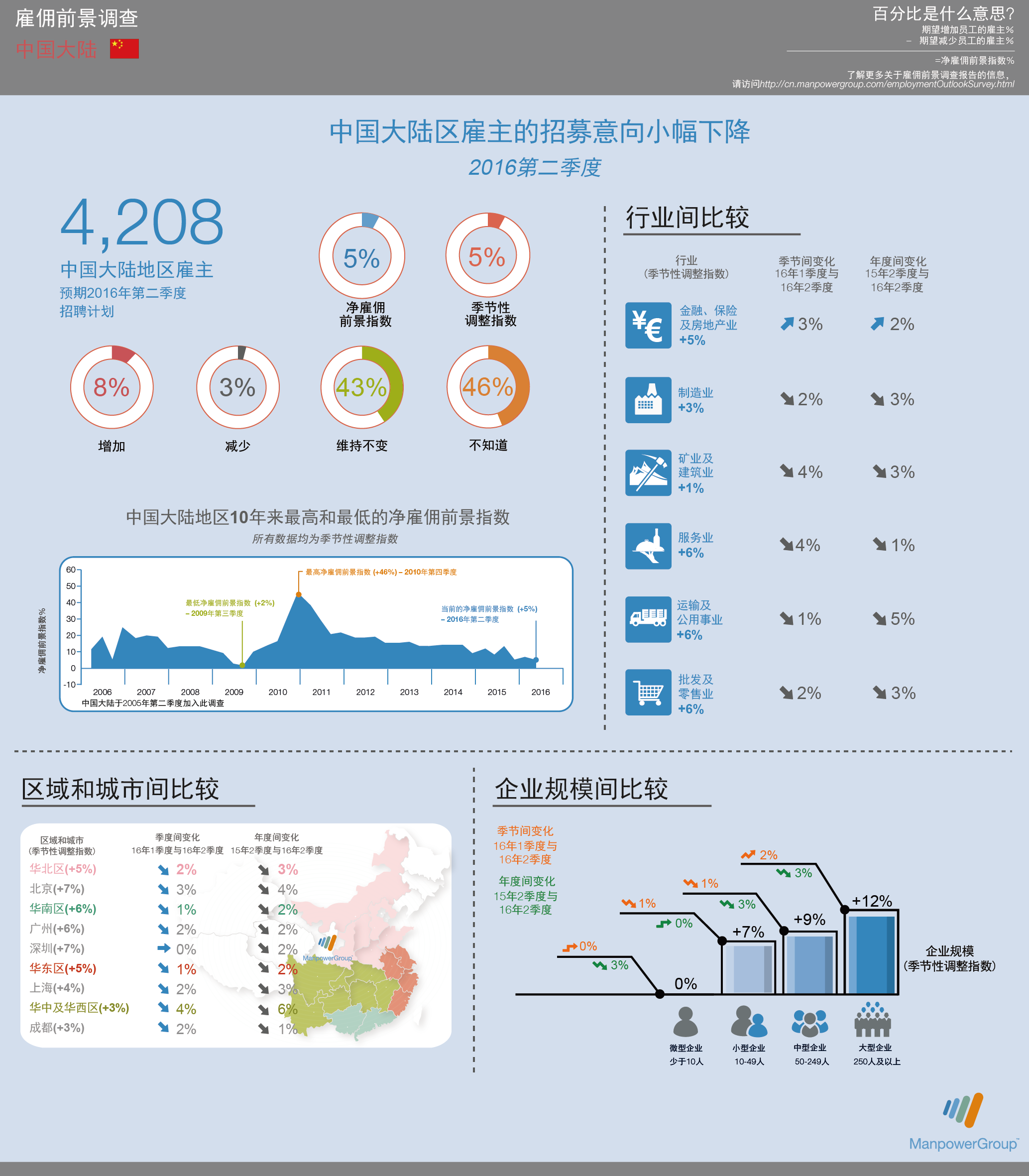 万宝盛华集团对中国大陆地区4,208家企业开展了最具前瞻性的雇佣前景调查,以此来了解中国大陆地区的企业在2016年4月到6月间增加或减少员工的意向。2016年第二季度,8%的中国雇主预期将增加员工数量,只有3%的雇主预计将减少劳动力。调查显示,43%的中国雇主表示2016年第二季度员工数量将不会有所变化,季度间相比,中国大陆地区的雇佣预期相对稳定,比例仅下降1个百分点。