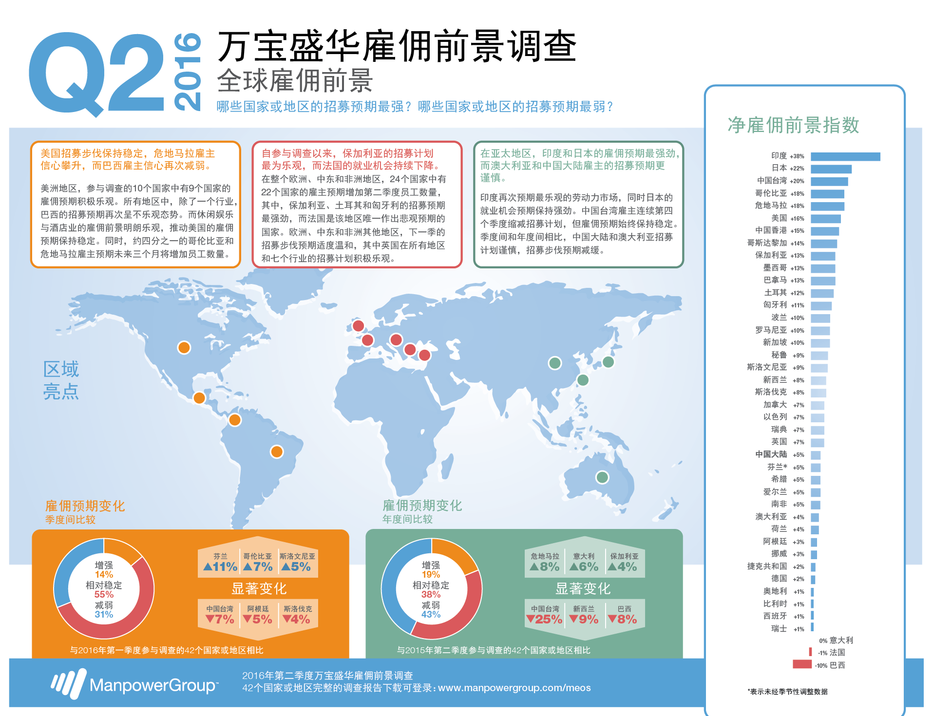 - 纵观全球,印度、日本、中国台湾、哥伦比亚和危地马拉预期2016年第二季度最乐观的招募预期。