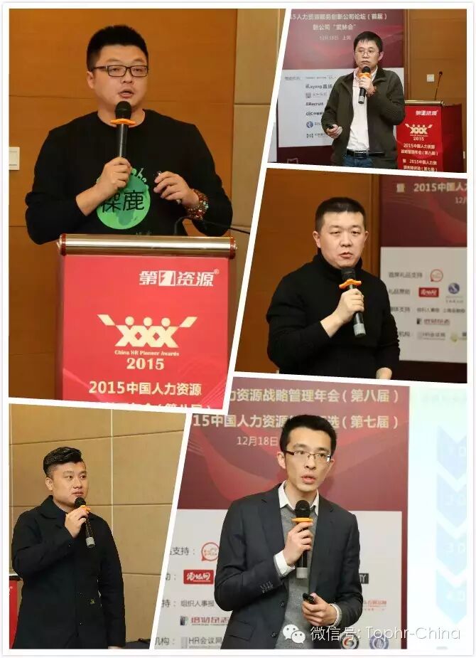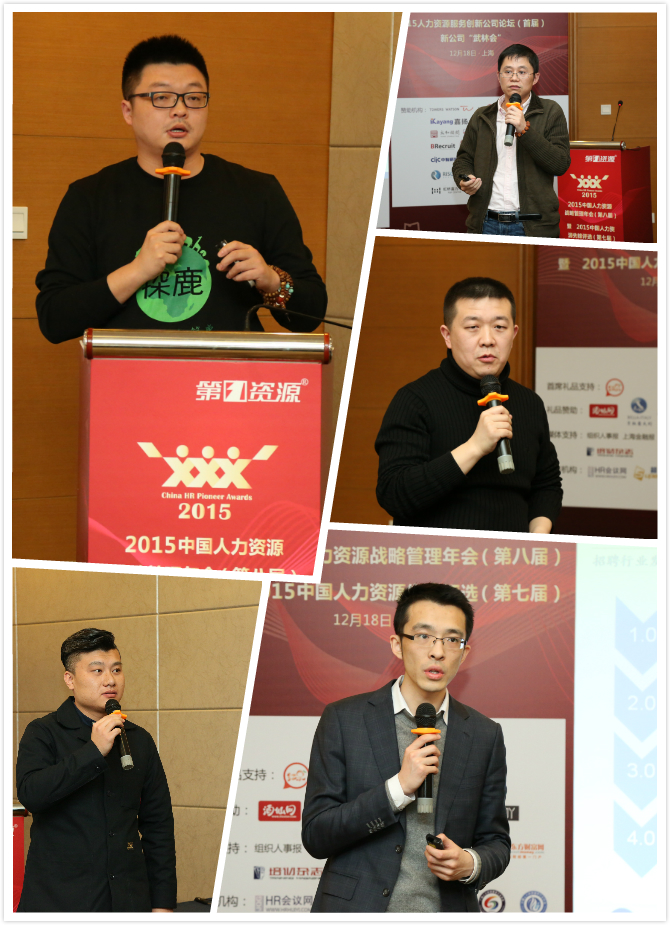 2015人力资源服务创新公司论坛(首届)以“新公司‘武林会‘”为主题,由《第一资源》主编毕蕾女士 主持本次论坛。探鹿联合创始人兼COO孟广先生 、理才网副总裁龚铭先生 、乔布简历创始人&CEO马晓先生 、职业梦联合创始人兼CEO黄海先生、找萝卜联合创始人&市场副总裁罗经纬先生 带来主题演讲“自由的就业和弹性的用工”、“人力资源SaaS的黄金时代”、“移动互联网给校园招聘带来的新机会”、“重构金融人才生态圈”、“触手可及,玩转不彻底的招聘时代”。创新公司的创始人们演讲生动活泼,赢得阵阵掌声。