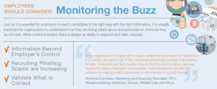 ➢ 口碑管理。对于组织而言,了解自身在社交媒体以及雇主审查网站等公开渠道上是如何被讨论及感知的十分重要。虽然不能完全控制,但是对于公司相关信息能快速做出反应或者从中学习。