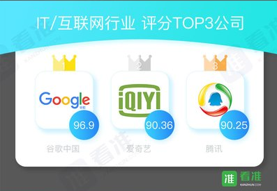 •IT/互联网:谷歌与腾讯成为榜首,意料之中。而爱奇艺让人惊喜的好表现,不禁使看准网联想到爱奇艺平台上各类火热的综艺《奇葩说》《姐姐好饿》;反观乐视近来表现,或给了对手以上升的机会。